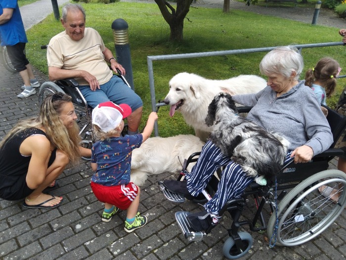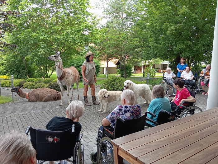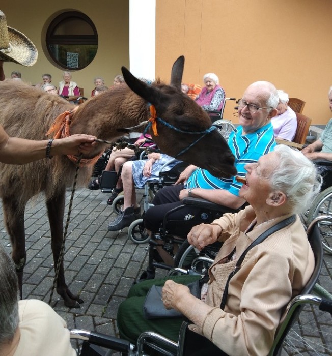Lamy mají své uplatnění i v léčebné terapii, jak se dnes dopoledne mohli přesvědčit naši uživatelé a uživatelky při lamaterapii. Paní Okáčová z Farmy U Lamáka z Ústupu u Olešnice k nám do domova přivezla i tři canisterapeutické psy.
